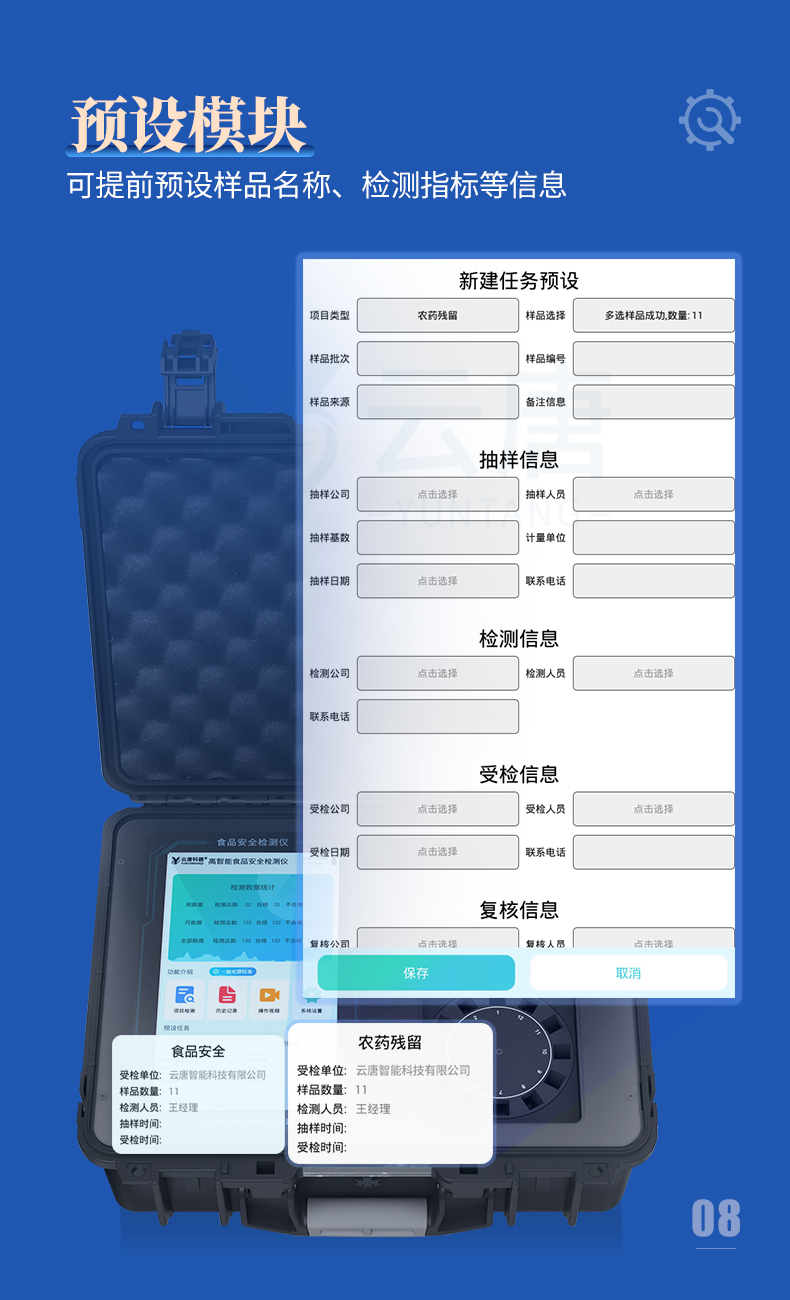 *6、儀器具有任務(wù)預(yù)設(shè)模塊,可在樣品送檢前提前預(yù)設(shè)樣品名稱、檢測(cè)指標(biāo)、送檢單位等信息,樣品送檢時(shí)一鍵調(diào)取保存信息,檢測(cè)更加方便快捷。