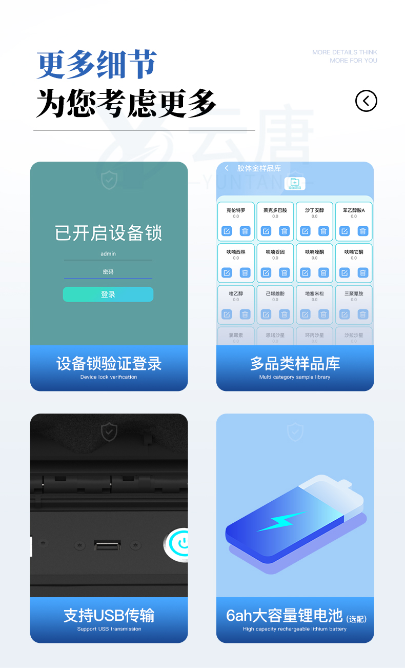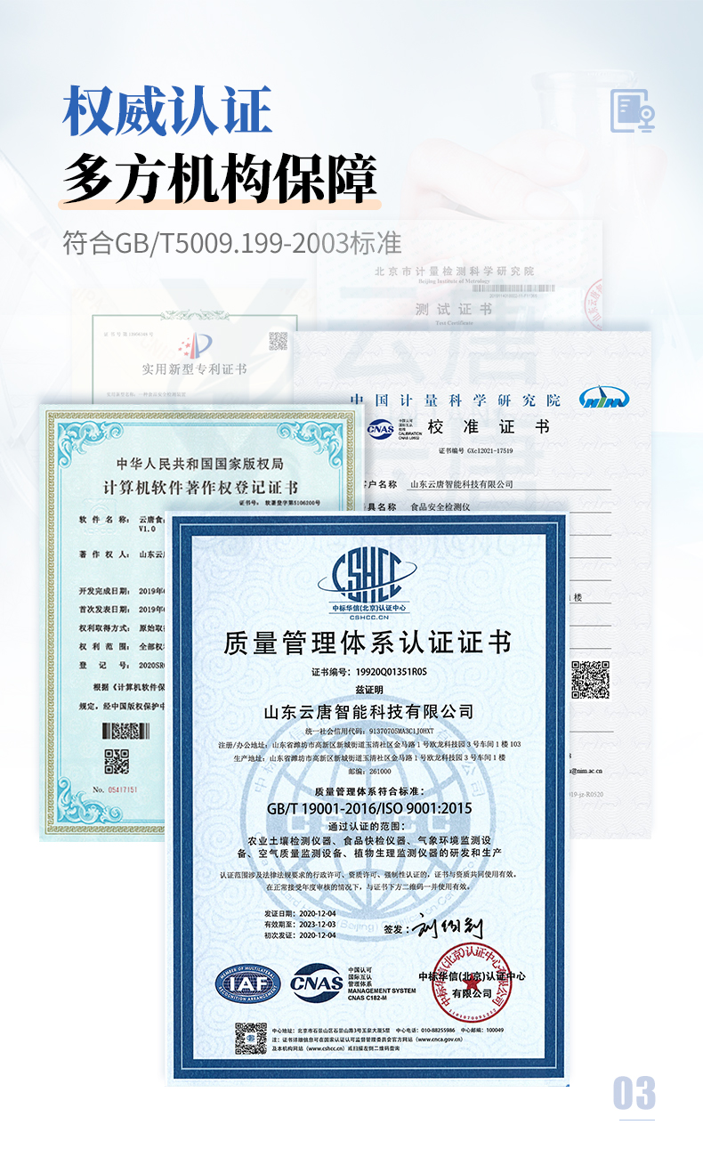 山東云唐智能科技有限公司生產(chǎn)的高智能食品安全檢測(cè)儀可快速檢測(cè)200多種食品安全項(xiàng)目,包含非食用化學(xué)物質(zhì)、濫用食品添加劑、農(nóng)藥殘留、獸藥殘留、重金屬、病害肉、營(yíng)養(yǎng)強(qiáng)化劑、抗生素類殘留、激素類殘留、真菌毒素類殘留、化學(xué)類殘留等項(xiàng)目的定性定量檢測(cè)。