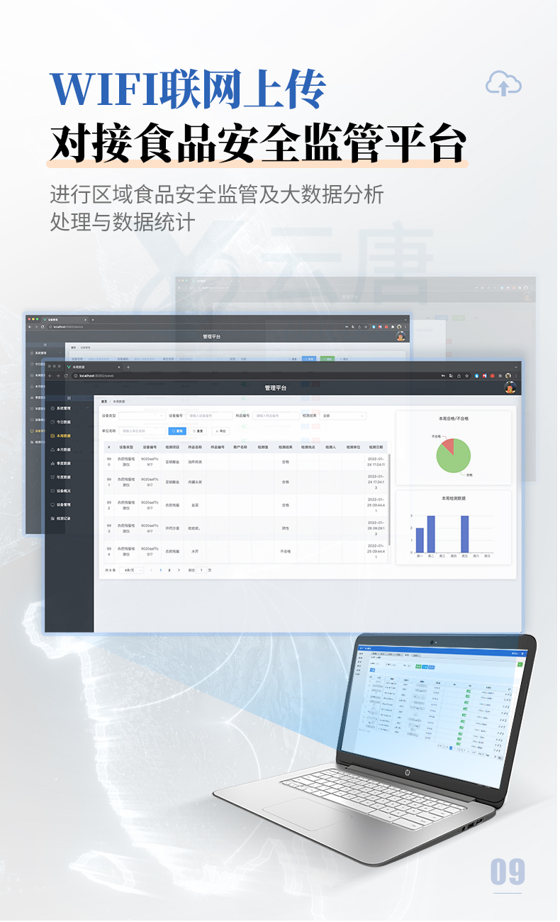12、儀器具有 wifi 聯(lián)網(wǎng)上傳、RJ45網(wǎng)線連接功能,可以快速上傳數(shù)據(jù)。同步對(duì)接監(jiān)管平臺(tái),數(shù)據(jù)可局域網(wǎng)和互聯(lián)網(wǎng)數(shù)據(jù)上傳,檢測(cè)結(jié)果直接傳至食品安全監(jiān)管平臺(tái)。進(jìn)行區(qū)域食品安全監(jiān)管及大數(shù)據(jù)分析處理與數(shù)據(jù)統(tǒng)計(jì),檢測(cè)區(qū)域食品安全長(zhǎng)短期動(dòng)態(tài),達(dá)到食品安全問題預(yù)估、預(yù)警。